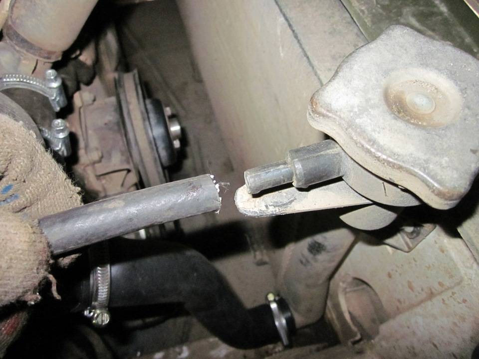 Из старого шланга вырезаем новый патрубок с термостата на головку.