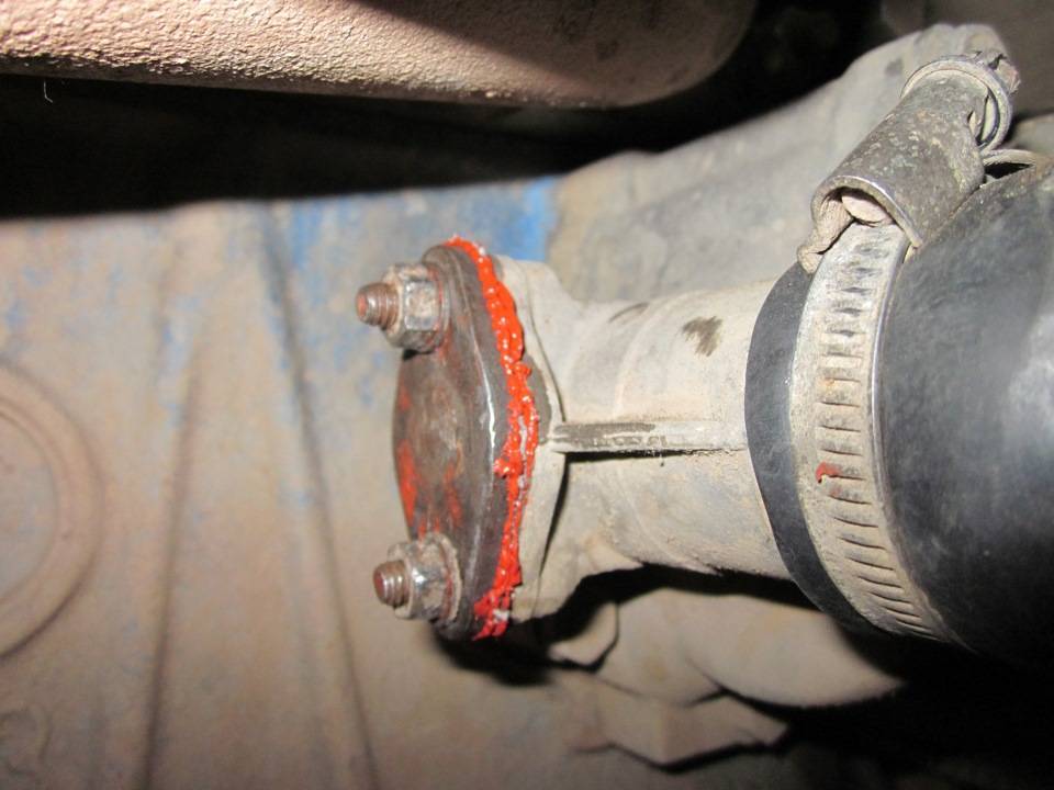 Откручивать нужно будет болты крепления хомутов, которые надежно соединяют патрубки и выводы термостата Нивы. Всего придется открутить три болта, которые хорошо видны ниже на картинке: