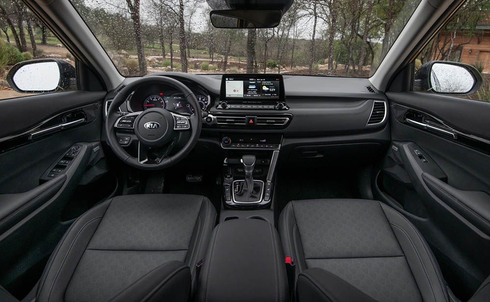 Внутри Kia Seltos водителя ждёт современный трёхспицевый мультифункциональный руль, стильная приборная панель, 5-7 дюймовые дисплеи бортового компьютера, а также мультимедийная система с экраном на 8-10,25 дюймов.