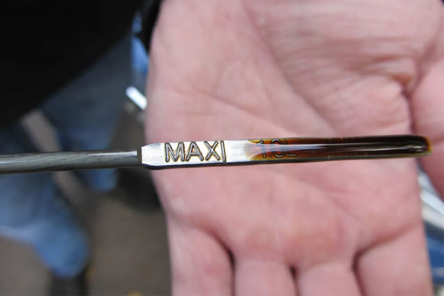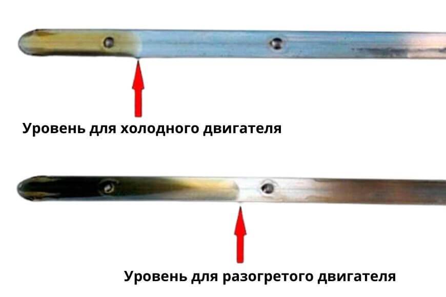 На поверхности прибора имеются метки: полоски, точки или дырочки. Нижняя из них обозначает минимальный уровень, верхняя, соответственно, максимальный. Нормальный уровень смазочной жидкости должен находиться либо между отметинами, либо ближе к верхней. Нормой считается даже если объем несколько ниже среднего. Доливается масло только в том случае, если его уровень упал до минимальной отметки. Переливать его тоже не стоит, иначе это приведёт к проблемам в работе двигателя;