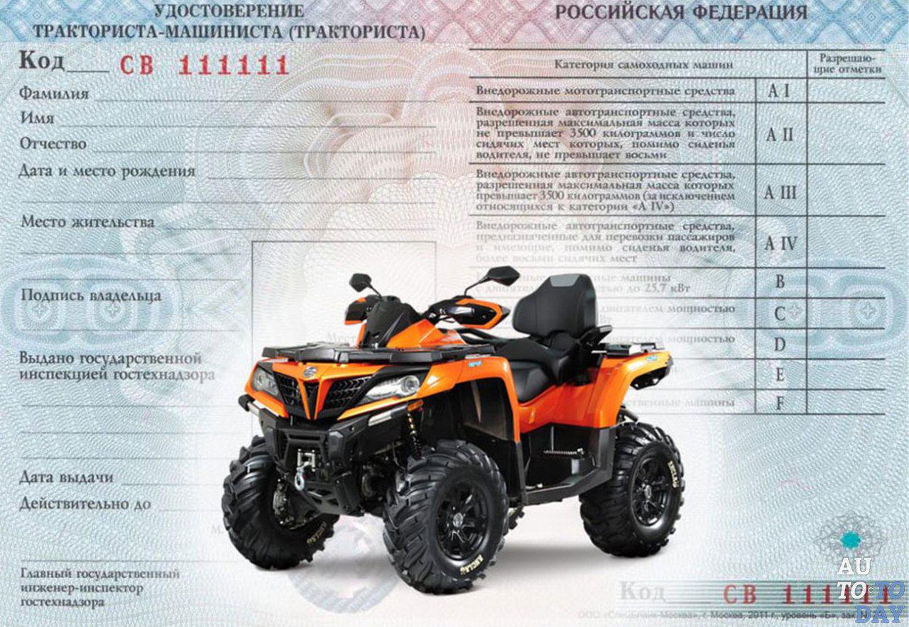- Для управления квадроциклом требуется водительское удостоверение категории А1 – аналогичное тому, которое необходимо для вождения трактора. Такое требование объясняется тем, что квадроцикл относится к категории внедорожного самоходного транспорта. Для получения удостоверения необходимо предоставить медицинскую справку, позволяющую управлять подобным транспортным средством.
