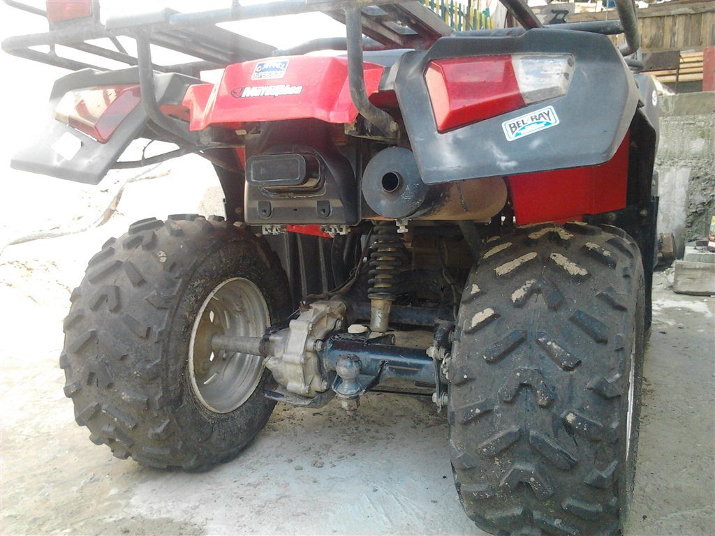 Данный квадроцикл по праву можно считать заднеприводным, усилия с двигателя мощностью 13.6 л.с. передаются за счет главной передачи (цепи) на заднюю ось. Чтобы в трудных дорожных условиях была возможность совершать маневры, квадроцикл оснастили задним ходом.