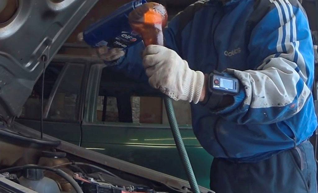 - закрыв сливное отверстие, уже через заливную горловину начинайте постепенно заливать свежее масло;