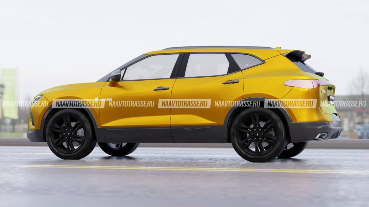 Корма у новинки имеет ступенчатую конфигурацию. Относительно компактное заднее остекление, расположившись под заметным углом, таким образом формирует незначительный выступ на багажном отсеке, на который разработчик вынес удлиненный стоп-сигнал. Последний соединяет суженную кормовую оптику с вертикально ориентированными светодиодами. Данное решение тоже делает новый «Москвич» похожим на Hyundai Tucson. В центре багажная дверь немного изгибается во внутрь, а расположенный ниже бампер, наоборот, выпирает назад. Он практически полностью укрыт защитным пластиковым обвесом и дополняется двумя выхлопными патрубками, один из которых, вероятно, выполняет декоративную функцию.