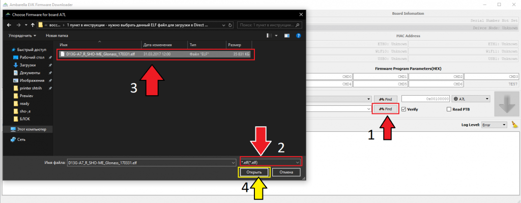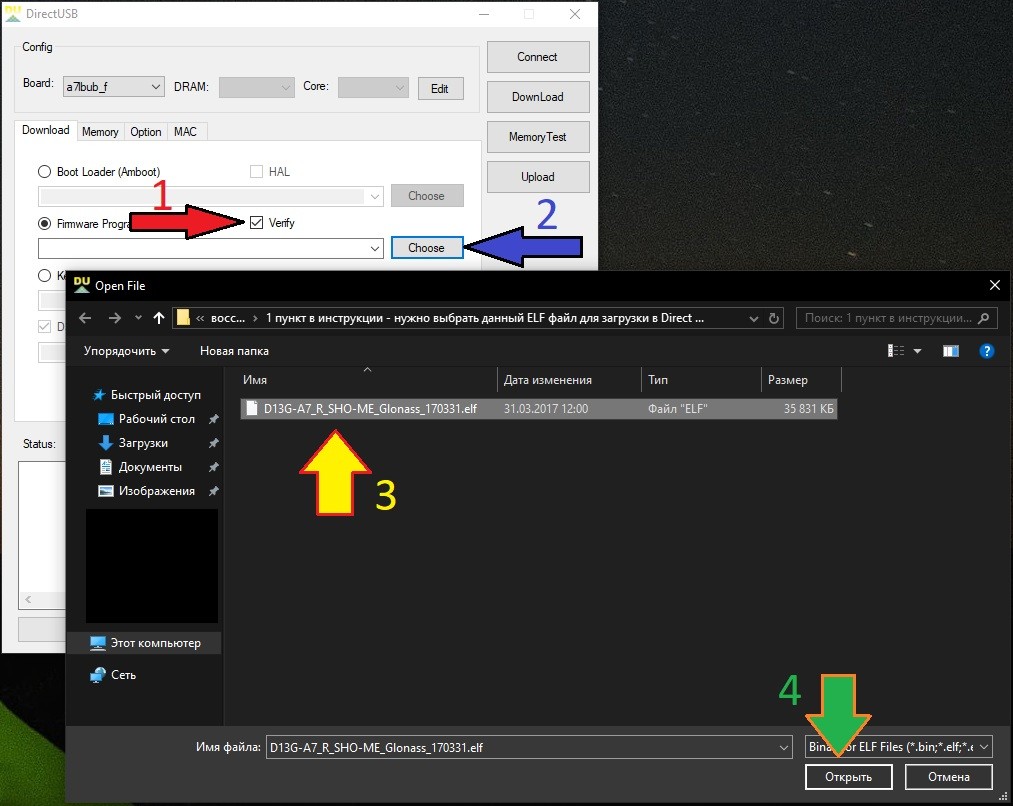Firmware | Finde – перейти в место хранения прошивки (D:\восстановление А7\1 пункт в инструкции – нужно выбрать данный ELF файл для загрузки в Direct USB\D13G-A7_R_SHO-ME_Glonass_170331.elf) – открыть.
