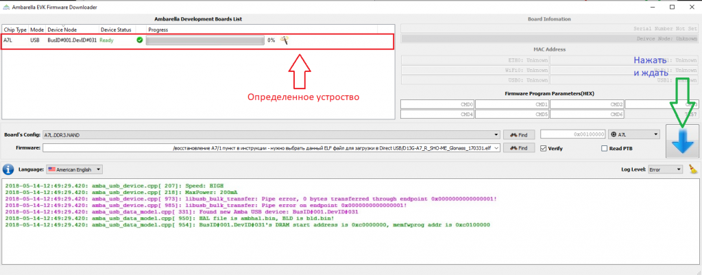 В случае успеха, в программе “AmbaUSB” в окне “Ambrella Development Board list” отобразится определённое устройство и загорится синяя стрелочка вниз, на которую нужно нажать и ожить завершения процесса.