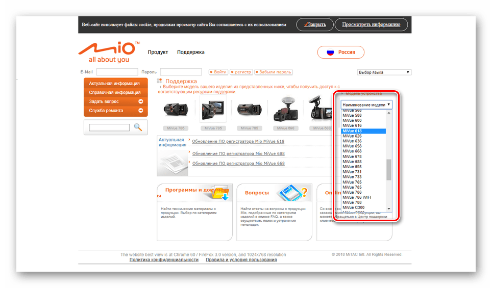 - Воспользовавшись указанной нами ссылкой, на странице поддержки MIO разверните меню «Модель устройства».