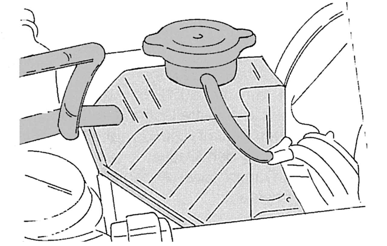 В бачке расположен датчик уровня охлаждающей жидкости. Если уровень находится ниже метки MIN, контакты датчика замыкаются и загорается контрольная лампа в комбинации приборов. Через патрубок, отходящий снизу расширительного бачка, охлаждающая жидкость поступает в систему или, наоборот, обратно в бачок в зависимости от объема залитой жидкости. Верхний патрубок служит для вентиляции. Система охлаждения вентилируется самостоятельно через шаровой клапан в термостате. Крышка расширительного бачка регулирует давление в системе.