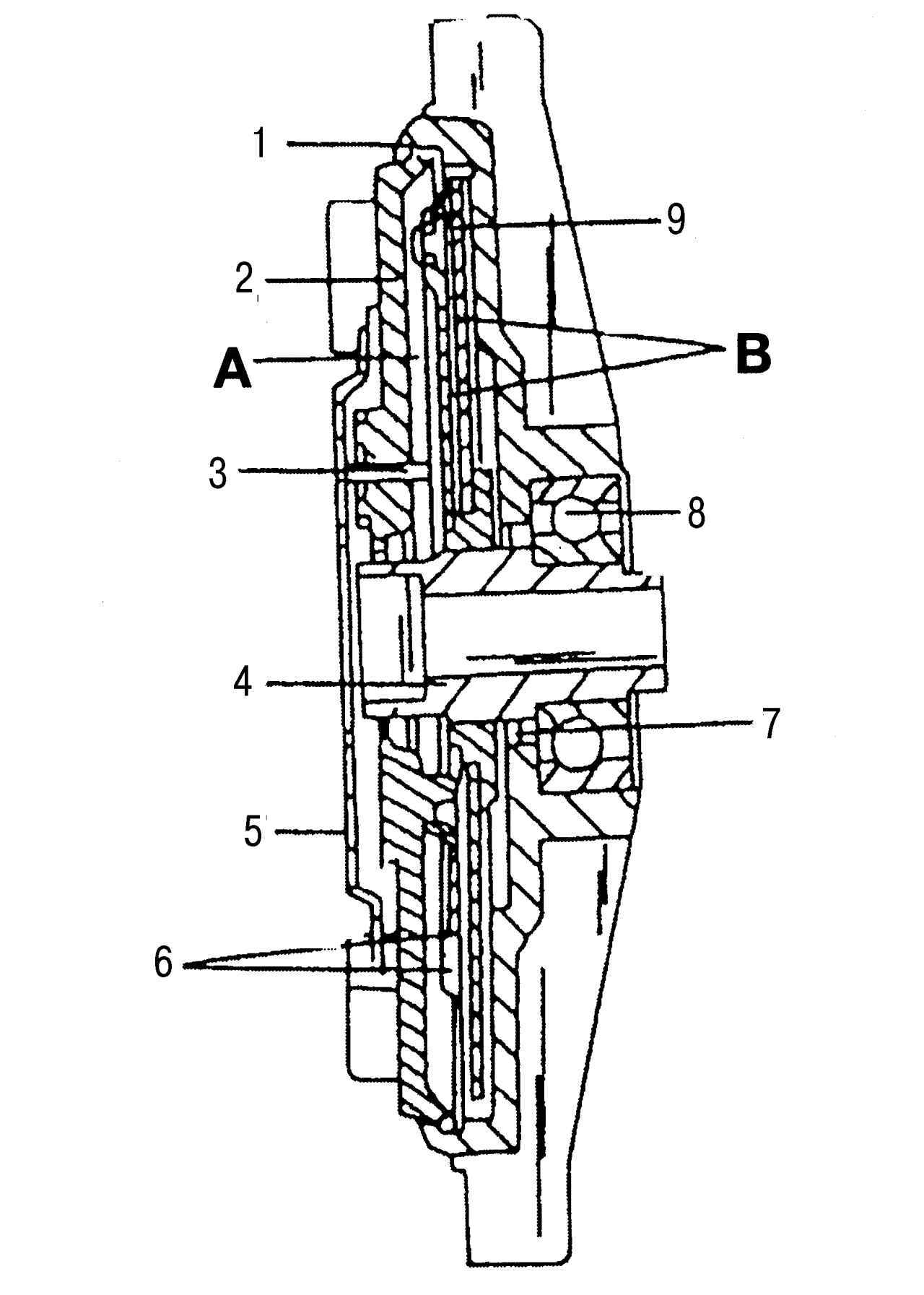 | Рис. 134. Вискомуфта вентилятора системы охлаждения (поперечный разрез): 1 – корпус; 2 – крышка; 3 – контактный штифт; 4 – втулка подшипника; 5 – биметаллический элемент; 6 – клапан; 7 – уплотнительное кольцо; 8 – шариковый подшипник; 9 – приводной диск; А – предварительная камера; В – рабочая камера |