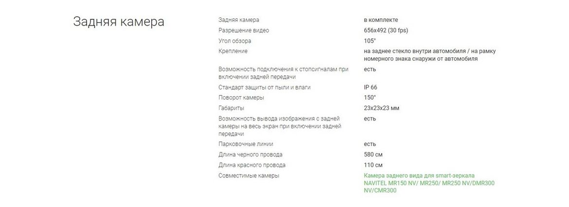Камера заднего вида предлагается в специальном защищенном корпусе и соответствует стандарту IP66, так что ее можно устанавливать не только внутри салона, но и снаружи. Угол обзора – 105 градусов, видео снимается в разрешении 656 x 492. Поворачивать камеру можно на 150 градусов. Качество съемки, несмотря на не самое высокое разрешение, вполе позволяет как комфортно маневрировать, так и использовать запись в ходе разбирательств в случае каких бы то ни было проишествий.