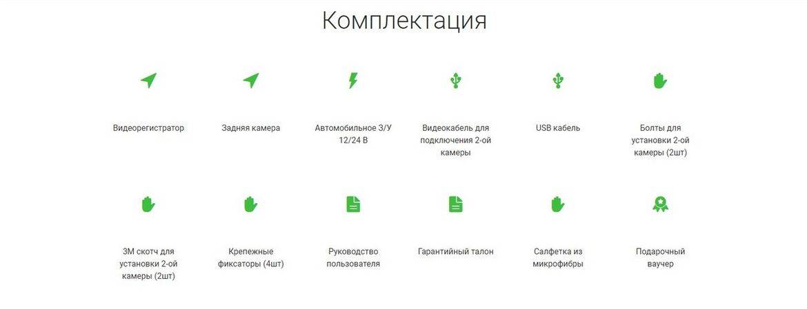В комплектацию устройства входят два набора стяжек крепления, зарядное устройство, USB-кабель, задняя камера с кабелем подключения, лицензию на «Навител Навигатор». Все это собрано в коробке из плотного картона в фирменных цветах бренда.