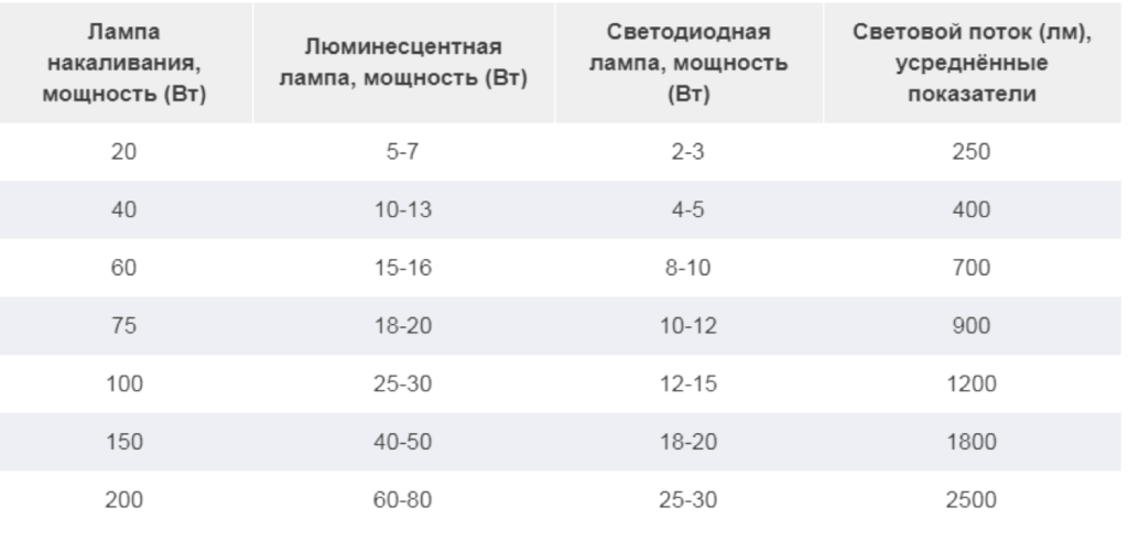 - эквивалентная мощность – лампочку накаливания какой мощности можно заменить;