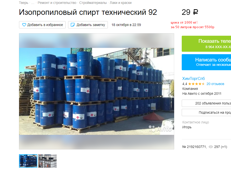 Спирт технический изопропиловый 92%, я всегда покупаю по объявлениям на авито, средняя цена за 20 литров (2200 рублей, до «коронобесия» спирт стоил порядка 800 рублей за 20 литров):