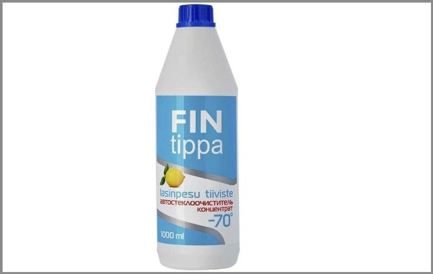 Концентрат “Лимон” от фирмы Fin Tippa с резким лимонным ароматом поставляется в пакете емкостью 1 л, оснащенном наконечником с винтовой пробкой. Жидкость занимает высокие позиции в рейтингах благодаря низкой температуре замерзания, материал хорошо удаляет реагенты и грязь со стекол автомобиля и не оказывает негативного воздействия на детали конструкции. Качество продукта зависит от партии, некоторые водители отмечают мутные разводы на очищаемой поверхности и несоответствие характеристик заявленным параметрам.
