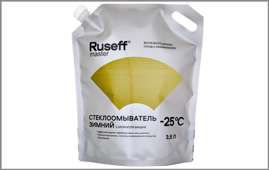 Раствор RUSEFF Master не является концентратом, поставляется в пластиковом пакете с заправочным наконечником вместимостью 3,5 л. Имеет приятный запах вишни, допускается разведение водой в пропорции 1 к 5 (например, для использования на протяжении зимы в южных регионах РФ). Благодаря использованию изопропилового спирта жидкость является безопасной для здоровья человека, обеспечивает удаление противогололедных реагентов и не оставляет разводов на стекле после испарения.