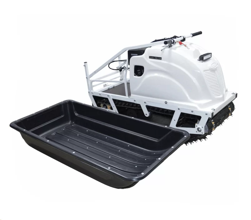 Устройство использует гусеницы для передвижения даже в большой снег. Имеет небольшие размеры, управляется с помощью рычагов газ и тормоз, и поворотного механизма.