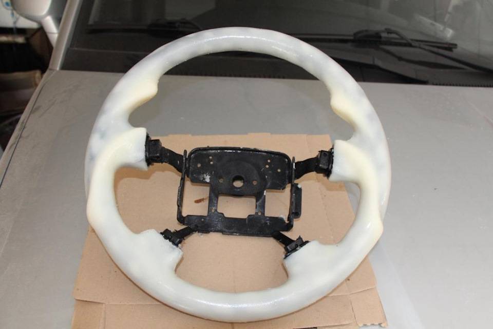 4. Как только вы закончите с изготовлением черновой, рабочей матрицы, можно приступать к работе над самим колесом. Для этого чаще всего используется стеклопластик с добавлением полиэфира. Неплохо подходит для этих целей аэросил. Этот материал удобен в работе, так как он весьма податлив поначалу, но при затвердении становится весьма прочным и гладким. Если предполагается создать сложный руль с большим количеством выступов, можно также задействовать в работу стекломат, который нужно укладывать постепенно в два-три слоя.