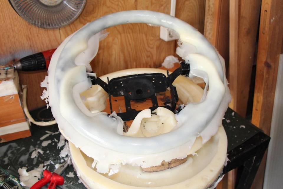 2. Следующий шаг – «потрошим» старый руль. Снимаем с него кожу, которой он был обтянут. Затем надрезаем резиновую часть в тех местах, где это предполагает макет.