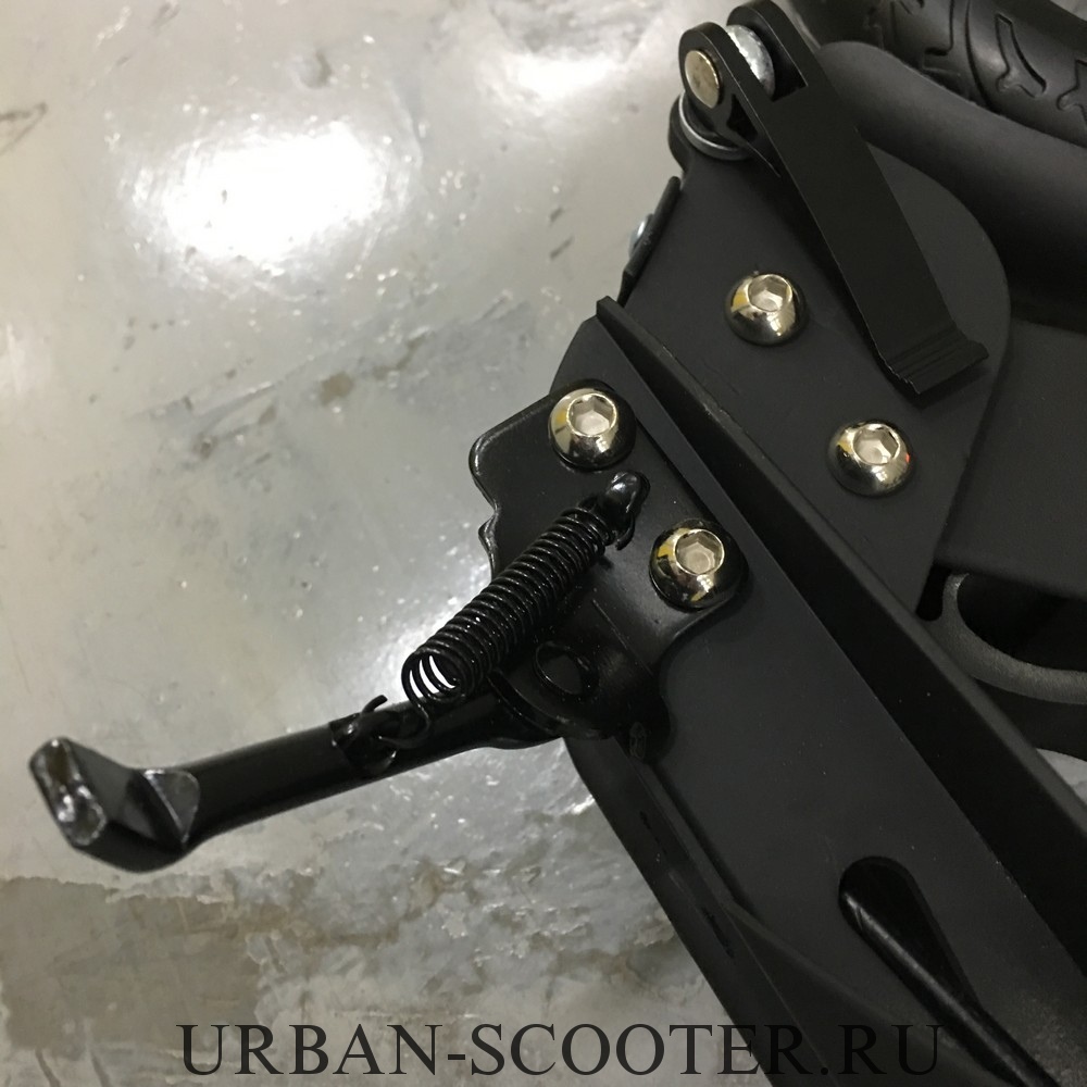 В комплекте к самокату прилагается складная стояночная подножка с болтами для крепления. Она устанавливается с левой стороны. Место установки легко определить по наличию отверстий для крепления. Приложите подножку таким образом, чтобы отверстия на платформе совпали с отверстиями на держателе подножки. Затем установите в отверстия болты. С обратной стороны наживите гайки и затяните болты. Для этого используйте шестигранник и гаечный ключ из комплекта. Гаечным ключом придерживаете гайку, шестигранником закручиваете болт.