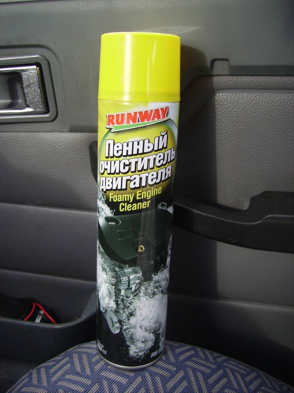 - Runway Engine Cleaner. Аэрозольный очиститель двигателя, выпускается в металлических баллонах объёмом 650 мл. Обладает средней эффективностью. При невысокой среди подобных средств цене неплохо справляется с относительно свежими загрязнениями. Не подойдёт для удаления высохших масляно-пылевых корок.