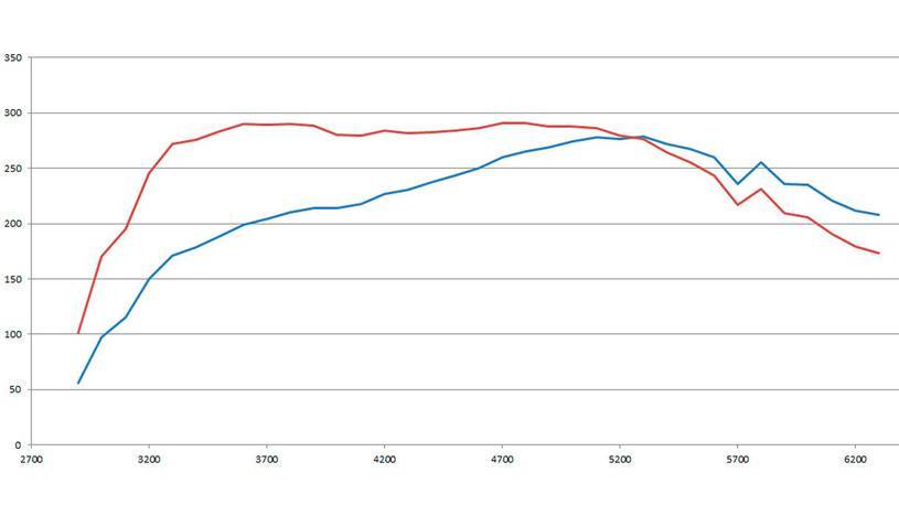 График момента (красная линия) и мощности (синяя линия) мотора турбомотора EcoBoost (объемом 2,3 литра), установленного на Ford Mustang. За отметкой в пять с половиной тысяч оборотов ловить уже нечего — и раскручивать коленвал сильнее смысла нет.
