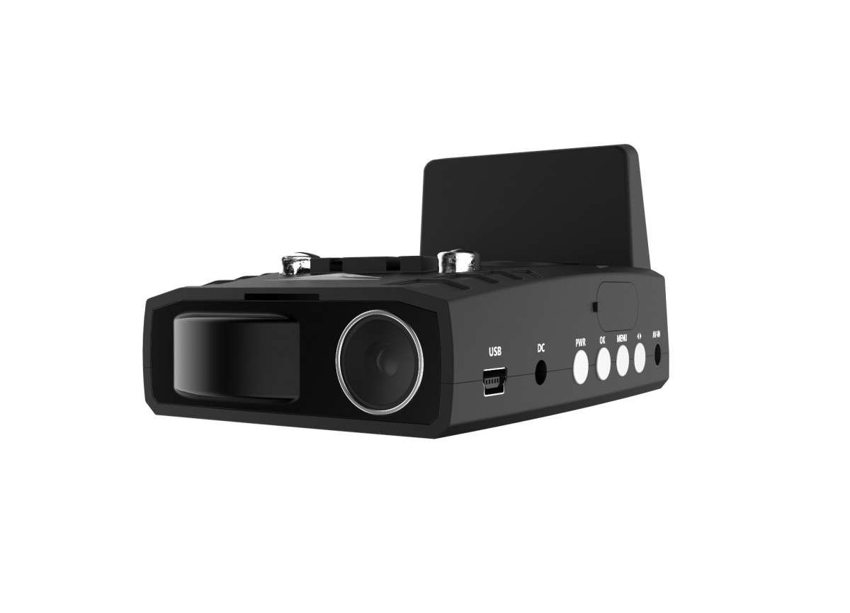 Задняя часть имеет дисплей, на 2 дюйма, который как бы выходит из основного корпуса, складывается мнение что он «прилеплен» сзади. Под дисплеем имеются три кнопки, две крайних прибавляют и убавляют громкость радара, средняя клавиша «M» настраивает функции радара