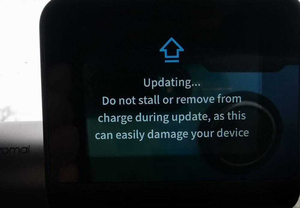 После успешной отправки прошивки на регистратор начнётся процесс прошивки, на экране появиться предупреждение, что во время обновления прошивки не вынимать зарядное устройство итд. Процесс прошивки занимается 10-15 секунд, после устройство перезагрузиться и запуститься в штатном режиме.