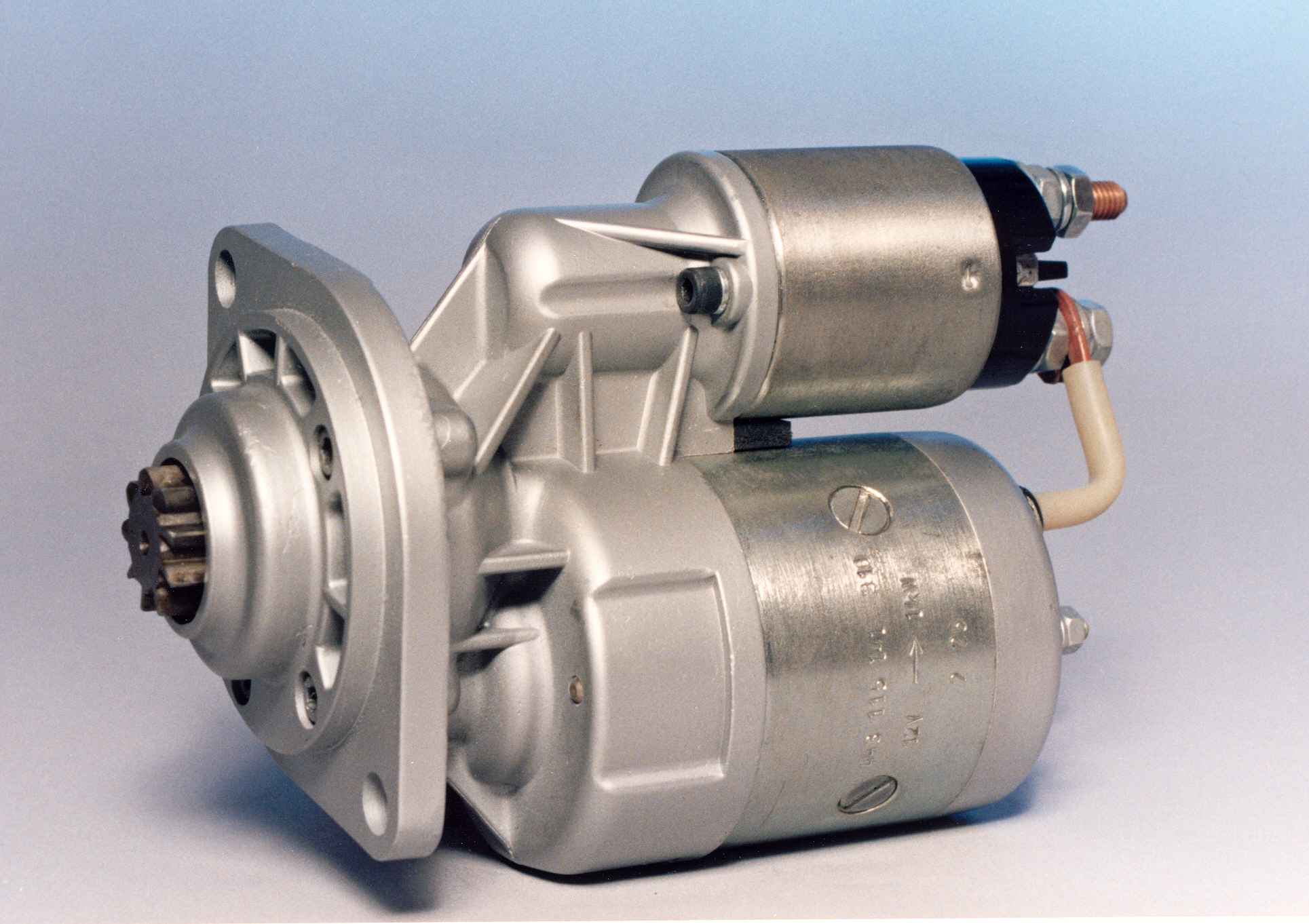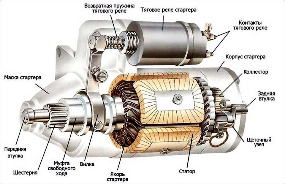 Стартер автомобиля – это компактный электродвигатель постоянного тока, коллекторного типа, на валу которого стоит шестерня, совпадающая по профилю с зубьями на маховике. На корпус этого электромотора прикручено тяговое реле (соленоид), сердечник которого в момент поворота ключа толкает шестерню в зацепление с маховиком и одновременно – смыкает контактную пластину – делает «мостик» для питания обмоток.