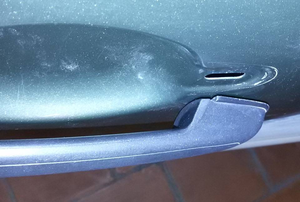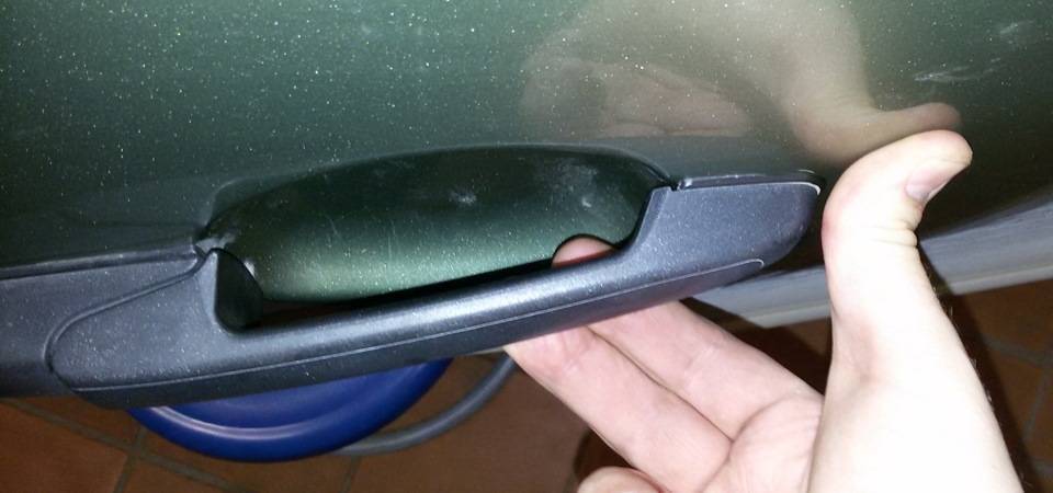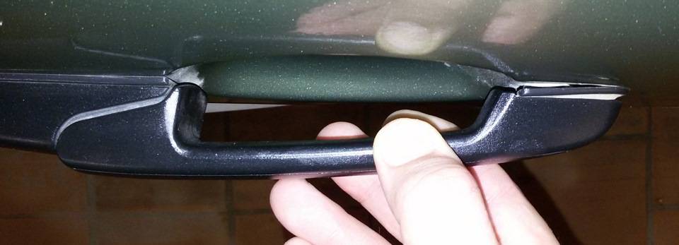 Дальше я издержал 15 минут на пробы стопроцентно вытащить ручку из двери. Хре… там . Не вышло. В чем прикол, я так и не сообразил. Все мои пробы двинуть ручку вперед, вспять, ввысь, вниз не посодействовали. Такое воспоминание, что прорезь в двери меньше фиксаторов самой ручки. Но как то же ее поставили. Ну и хорошо. Т.к. в этом случае у меня не было неотклонимой необходимости снимать всю ручку, мне хватило и того, что передняя часть снималась без заморочек. Мне был нужен лишь крючок, держащий переднюю часть ручки и служащий специфичной петлей. Вот он то с течением времени и разгибается приводя к тому, что я демонстрировал сначала текста.