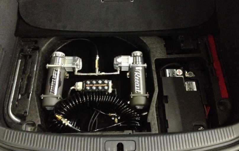 Компрессор и ресивер пневмоподвески, установленные в багажнике машины