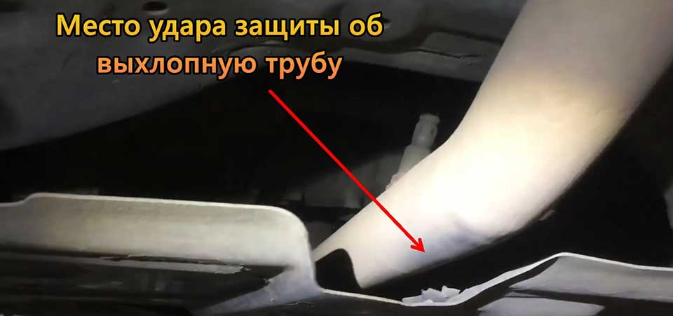 Возможно, при заливке масла или выполнении иных работ этот элемент автомобиля установили неправильно. При этом выхлопная труба оказывается близко к защите.