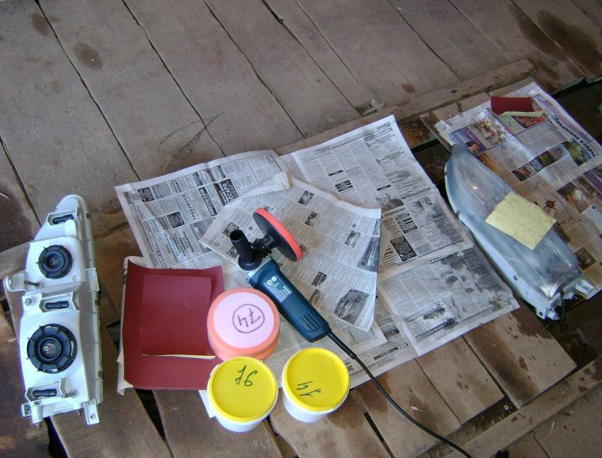 При любой полировке, фары тут не исключение, могут применяться следующие расходные материалы, приспособления и оборудование:
