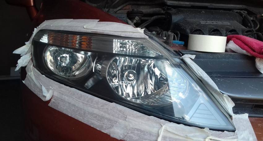 - Обязательно обклеить металлическую часть и уплотнительную резинку фары, для предохранения от повреждения полировочными средствами.