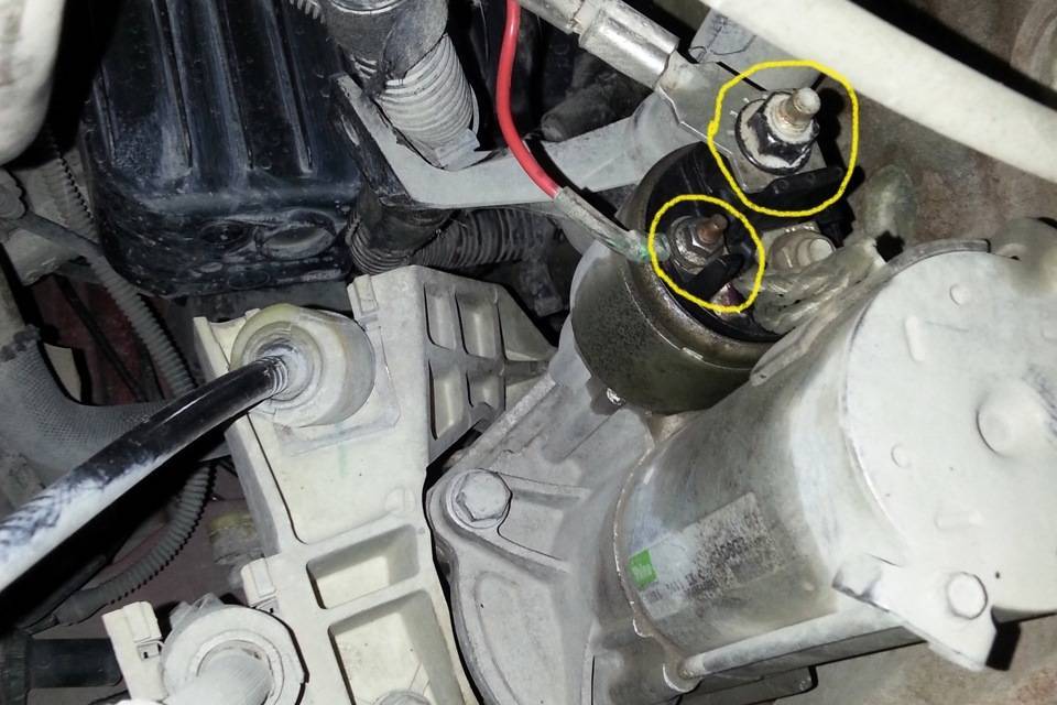 Когда мы скрутили два болта со втягивающего и два болта крепления стартера, нужно открутить последний болт 3-ий, который держит стартер. Он в отличие от этих двух, закручивается/откручивается с другой стороны! Чтобы его вообще найти, я потратил много времени, просто не замечал! Объясню где. Он находится под воздушным фильтром там есть два болта в районе стартера. Первый (он же ближний к вам) это не тот, а второй тот что нужен — его можно изначально вообще не увидеть, он располагается под этим самым первым ближним болтом.