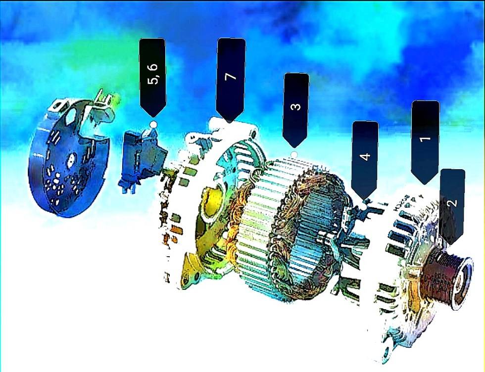 Автомобильные генераторы, как и другие разновидности генераторов, выполняют одну и ту же функцию и имеют один и тот же состав. Различаться могут лишь размеры и конструктивные особенности отдельных элементов. Типичный генератор состоит из 7 элементов: