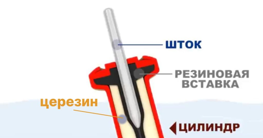 Устройство термостата тоже не сложное. В его основе находится цилиндр, наполненный церезином, по своим свойствам напоминающим воск. В него помещается резиновая вставка с металлическим штоком. При нагревании церезин превращается в жидкость и расширяется, при этом выталкивая из цилиндра металлический шток.