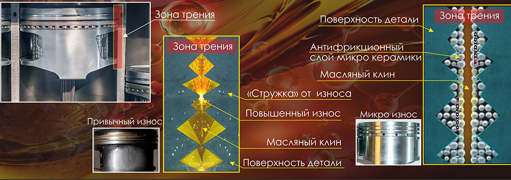 После того, как данные компоненты попадают на поверхности трущихся деталей, они создают тонкий слой, который заполняет мелкие дефекты, частично выравнивает поверхности, улучшая работу подшипников коленвала и элементов ЦПГ.