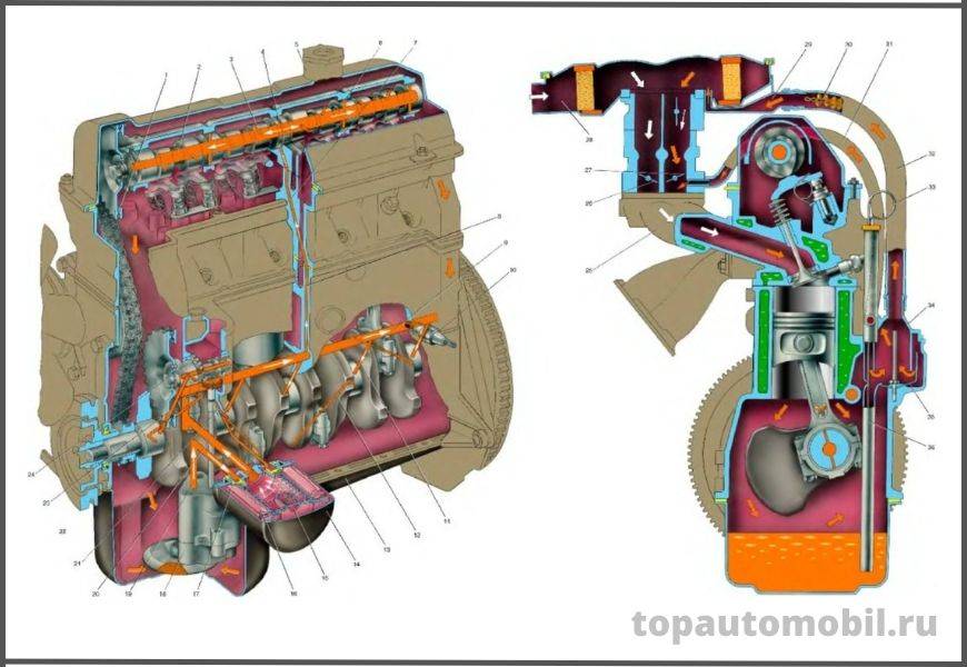 При запуске двигателя начинает работать масляный насос, который постепенно увеличивает давление. Масло циркулирует по системе, предварительно пройдя фильтр очистки. Жидкость в основном смазывает узлы, в которых возможен наибольший износ: шейки коленчатого вала, распределительные валы и клапаны. После этого она сливается с картером, где достигает шатуна и рассеивается на стенках цилиндров. Затем маслосъемные кольца очищают цилиндры. Весь процесс смазки непрерывен и продолжается до тех пор, пока работает двигатель.