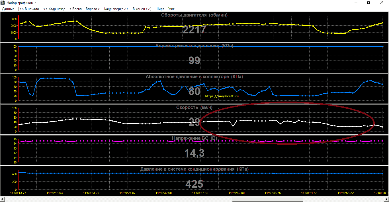 Именно так произошло и в нашем случае. Вот эти провалы означают нестабильный сигнал с датчика скорости.