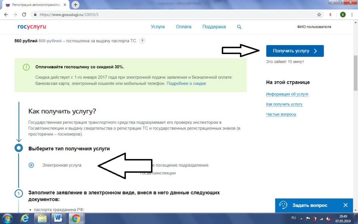 Гражданин заполняет заявление на получение или запись услуги, где указываются паспортные данные пользователя. Также пользователь указывает тип транспортного средства (для квадроцикла – прочие ТС).
