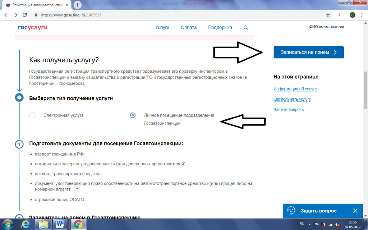 Если владелец хочет поставить квадроцикл на учет через посещение ведомства, на шаге 5 нужно выбрать графу «Личное посещение ведомства». Тогда появится иконка «Записаться на прием».