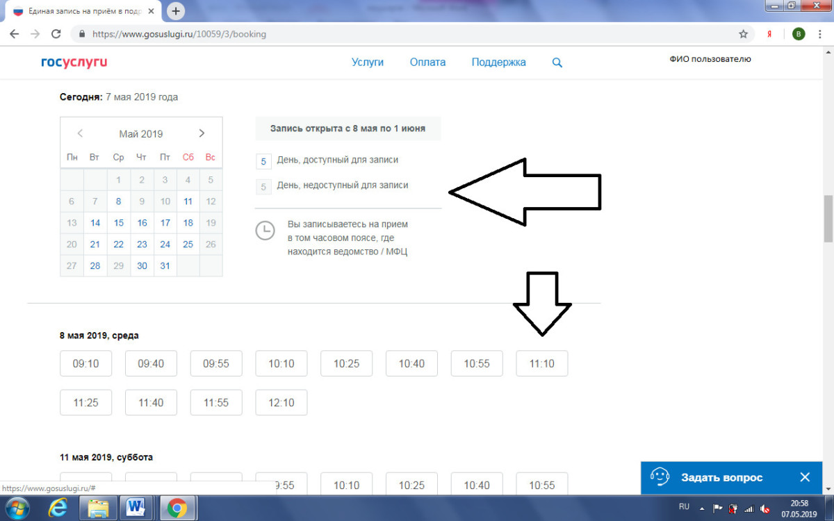 Ниже появятся доступные для записи даты и время. Нужно нажать на подходящие.