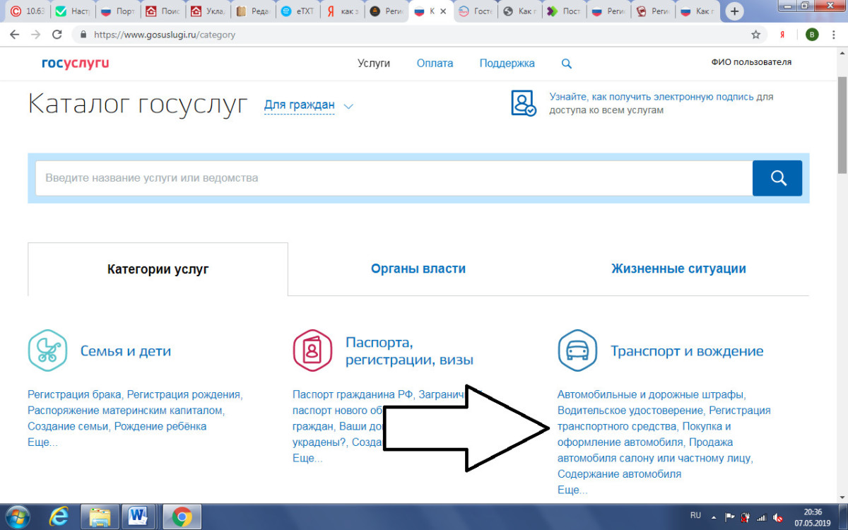 Нужно открыть каталог услуг и выбрать категорию «Транспорт и вождение»