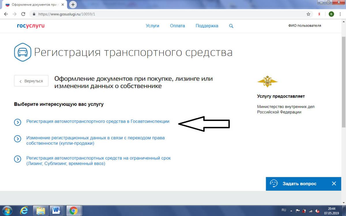 Необходимо выбрать «Регистрация автомототранспортного средства в Госавтоинспекции»