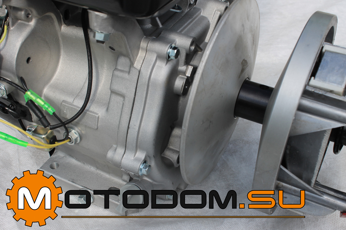 Двигатель с вариатором может быть зафиксирован на подмоторной раме совместно с ведомым шкивом вариатора. Преимущество двигателя с вариатором заключается в том, что вариаторы являются надежными устройствами позволяющими бесступенчато изменять передаточное отношение. При этом сам вариатор не только плавно изменяется передаточное отношение в известном диапазоне, но одновременно выступает в качестве муфты сцепления. Высокая надежность вариаторов связано с простотой конструкции и минимуме используемых деталей. Однако следует оговориться, вариаторы, как правило, устанавливают на двигатели и аппараты малой мощности. Более подробно о комплектации модуля для мотобуксировщика (комплект M2), доступно на странице описания.