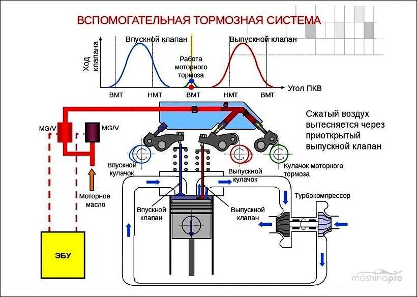 К примеру так называемый, горный тормоз. Торможение происходит двигателем, при движении автомобиля на передаче. Принцип его заключается в том, что кратковременно, специальными заслонками перекрываются впускные и выпускные патрубки, а так же прекращается топливо для работы двигателя. В цилиндрах создается вакуум и двигатель начинает затруднять движение автомобиля, тем самым его замедляя.