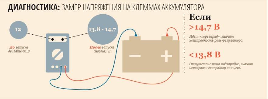 генератора мультиметром начинается с замеров напряжения на АКБ на холостых