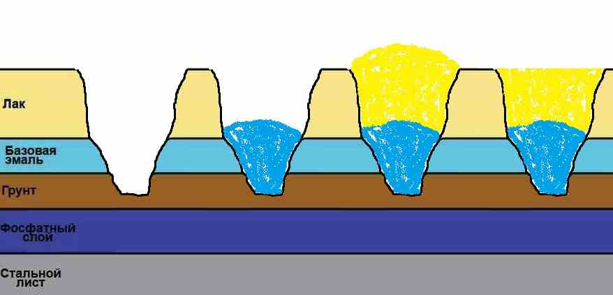 Если скол или царапина имеет заглубление, то восстановительный процесс предполагает несколько этапов: