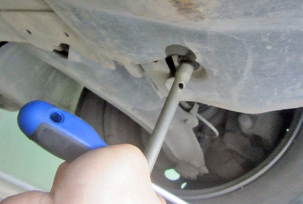 Автомобиль необходимо приподнять. Для этого может быть использовано специальное оборудование, но если его нет в наличии, то можно применить домкраты, при помощи которых автомобиль устанавливается на подставки.