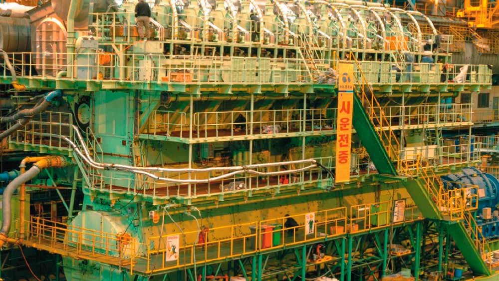 Также добавим, что модель Wartsila — Sulzer 14RTA96-C (14-цилиндровая версия) имеет вес в 2 тысячи 300 тонн, причем это «чистый» вес, то есть без учета моторного масла и других техжидкостей, которые дополнительно заливаются в агрегат. Только один коленчатый вал этого гиганта весит 300 тонн. В длину установка имеет 26.7 м, а по высоте показатель составляет 13.2 метра.